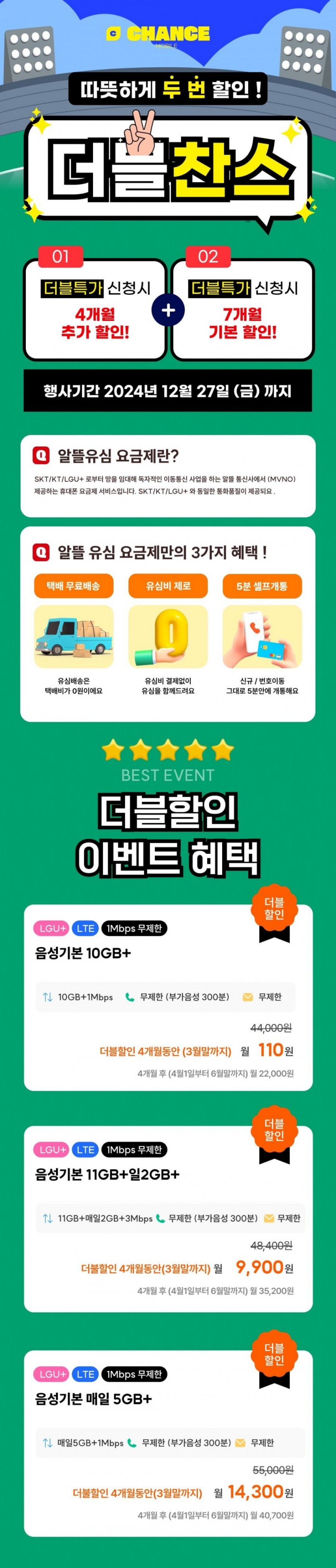 찬스모바일 초특가 작성자 정보 관리자 작성 작성일 2024.12.23 19:53 컨텐츠 정보 1,979 조회 0 추천 0 비추천 목록 본문 찬스모바일쉽고 빠른 개통, 통신비 절감의 찬스!https://chancemobile.co.kr/view/distributor/phone_plan_distributor.aspx?poscd=bcd188635790aefcd14ba77b3f85b1c0 알뜰폰 10GB+1MPS 3월30일까지 100원알뜰폰 11G+2GB+3MBPS 3월30일까지 9900원 . 100기가+5mps . 14000원 . 3월까지쓰고 4월에 번호이동 하심 될거 같네요.그리고 테더링 필요하신분은 엘지 특성상 E심 섞어서 하는 것도 추천 드립니다. E심 개통도 가능하다고합니다.#viral#fyp#tiktok#comedy 0 추천 0 비추천 SNS 공유 관련자료 링크 https://chancemobile.co.kr/view/distributor/phone_plan_distributor.aspx?poscd=bcd188635790aefcd14ba77b3f85b1c0 807 회 연결 이전 리쏘 영원씨 안마의자 작성일 2025.02.08 21:35 다음 “나야, 흑백요리사” 출연진들의 식당 리스트 총정리! 작성일 2024.10.11 16:23 댓글 0 등록된 댓글이 없습니다. 로그인한 회원만 댓글 등록이 가능합니다. 목록